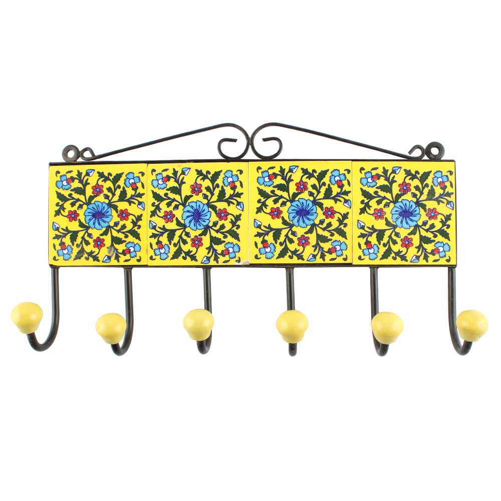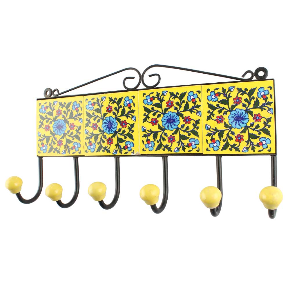 Yellow Base Turquoise Wheel Flower Ceramic Tiles Hook. When Put on Wall or Cabinet It is An Art in Itself. The Metal Part of this Hook is Black Powder Coated.