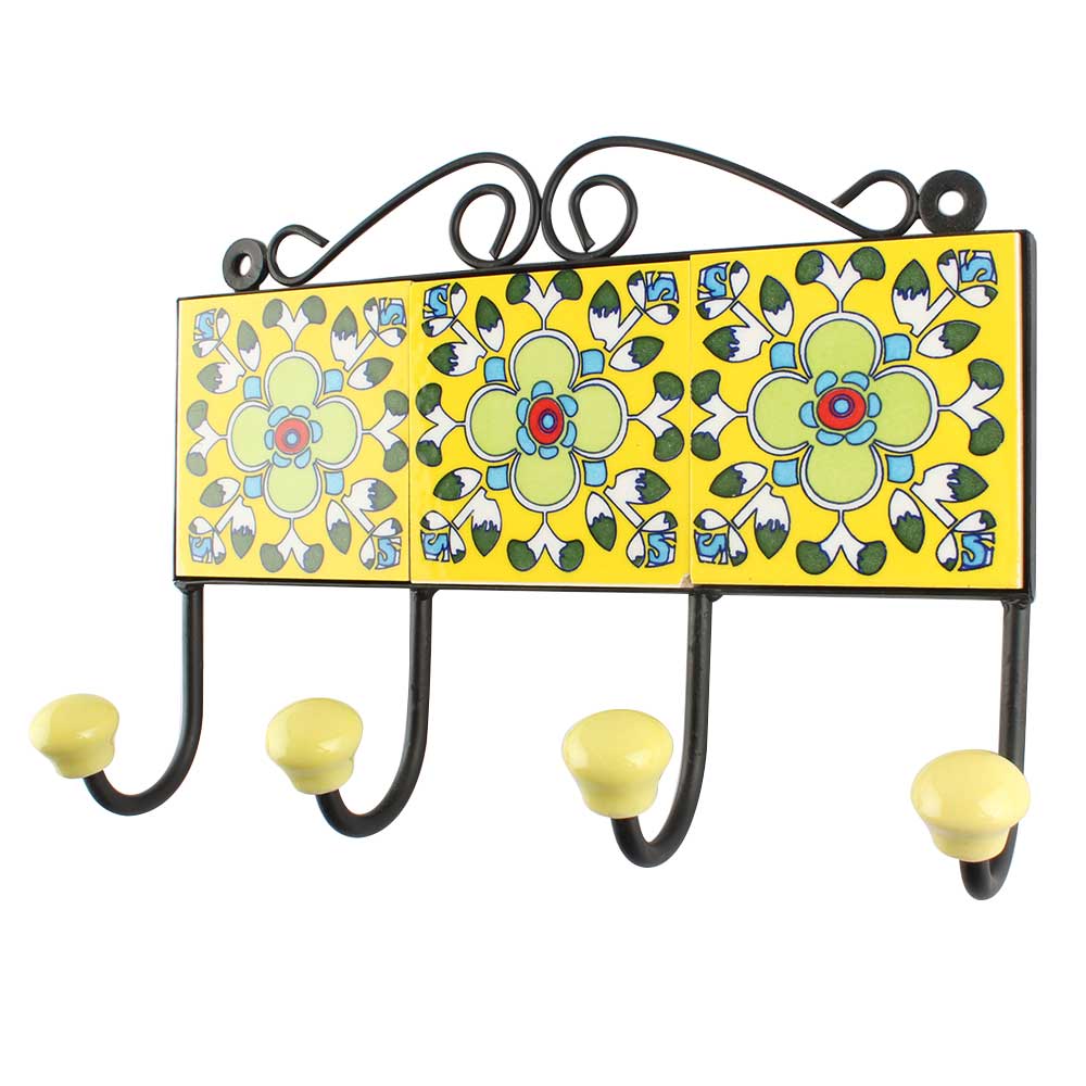 Yellow Ceramic Floral Tile Hook Online. When Put on Wall or Cabinet It is An Art in Itself. The Metal Part of this Hook is Black Powder Coated.