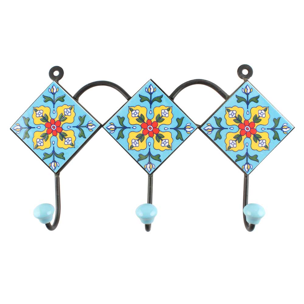 Yellow Ceramic Floral Tiles Hook. When Put on Wall or Cabinet It is An Art in Itself. The Metal Part of this Hook is Black Powder Coated.