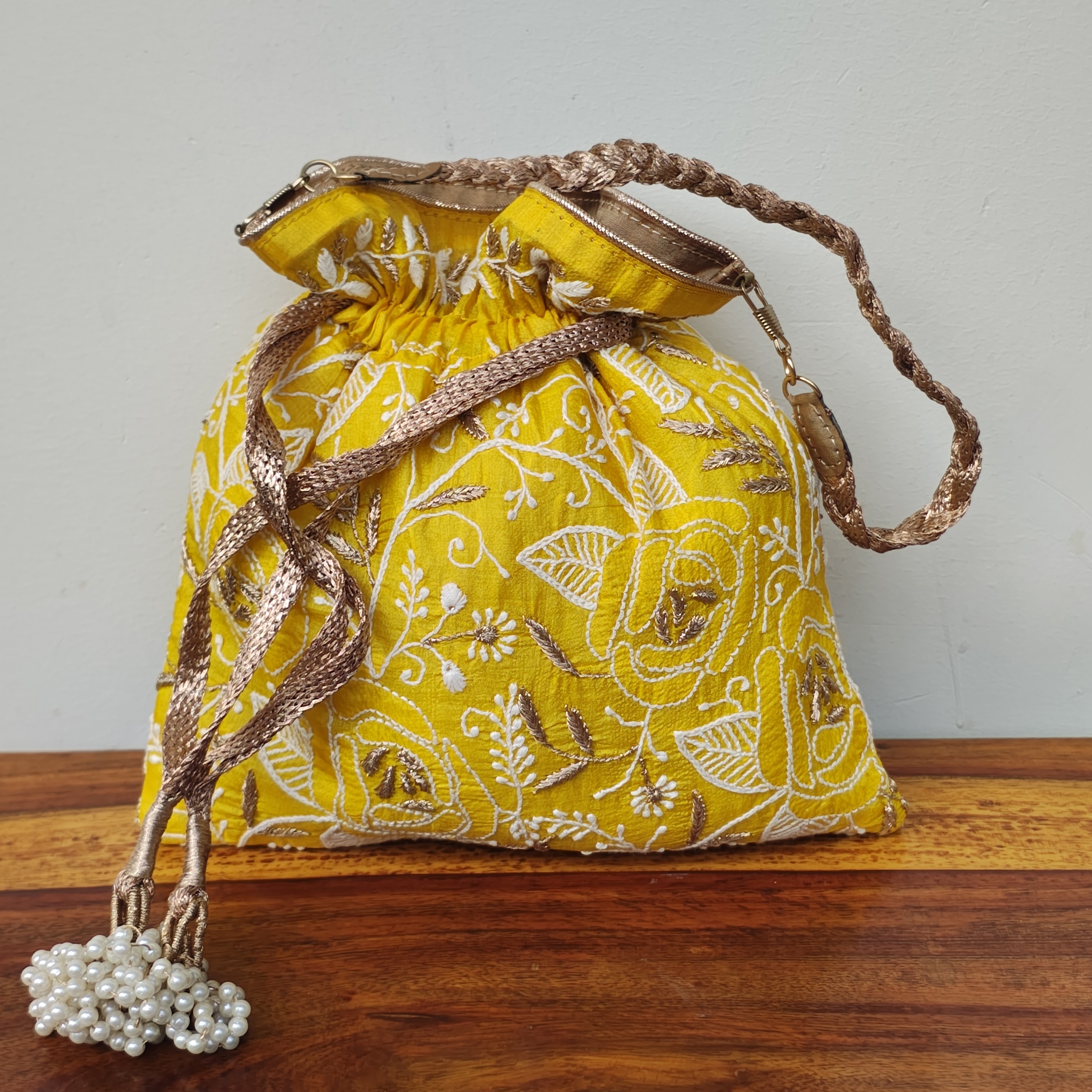 Brighten your ethnic wardrobe with this vibrant handcrafted potli bag, made from rich tussar silk in a lively mustard yellow shade. Both sides of the bag are adorned with intricate Chikankari embroidery, featuring delicate floral motifs highlighted with shimmering gold kasab thread. The artistry exudes traditional elegance with a fresh, festive flair. Designed for both style and convenience, the potli includes a braided golden handle and a drawstring closure, accented with charming pearl tassels at each end. It’s lightweight, easy to carry, and spacious enough for all your small essentials, making it a perfect companion for weddings, poojas, festive events, or evening outings. Whether you’re styling a saree, a salwar suit, or an Indo-western ensemble, this cheerful and elegant potli adds the perfect pop of color and grace to your look. A beautiful fusion of timeless craftsmanship and contemporary fashion.