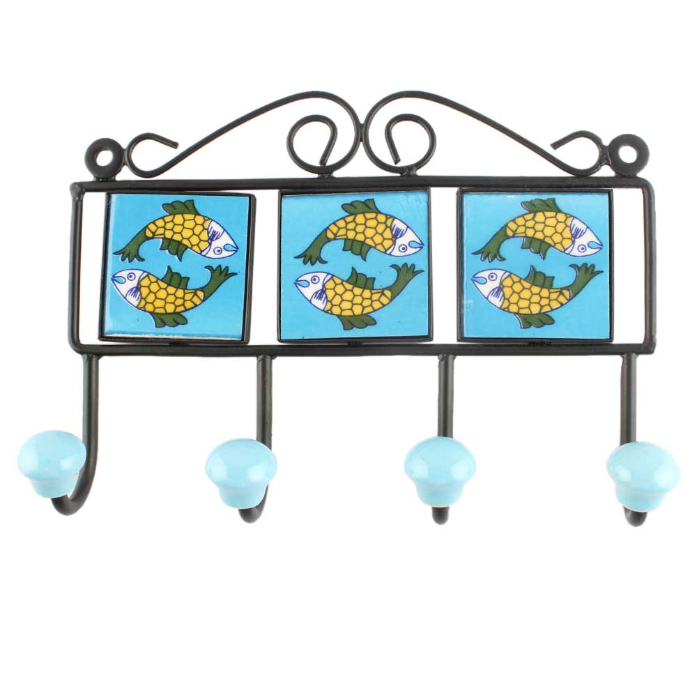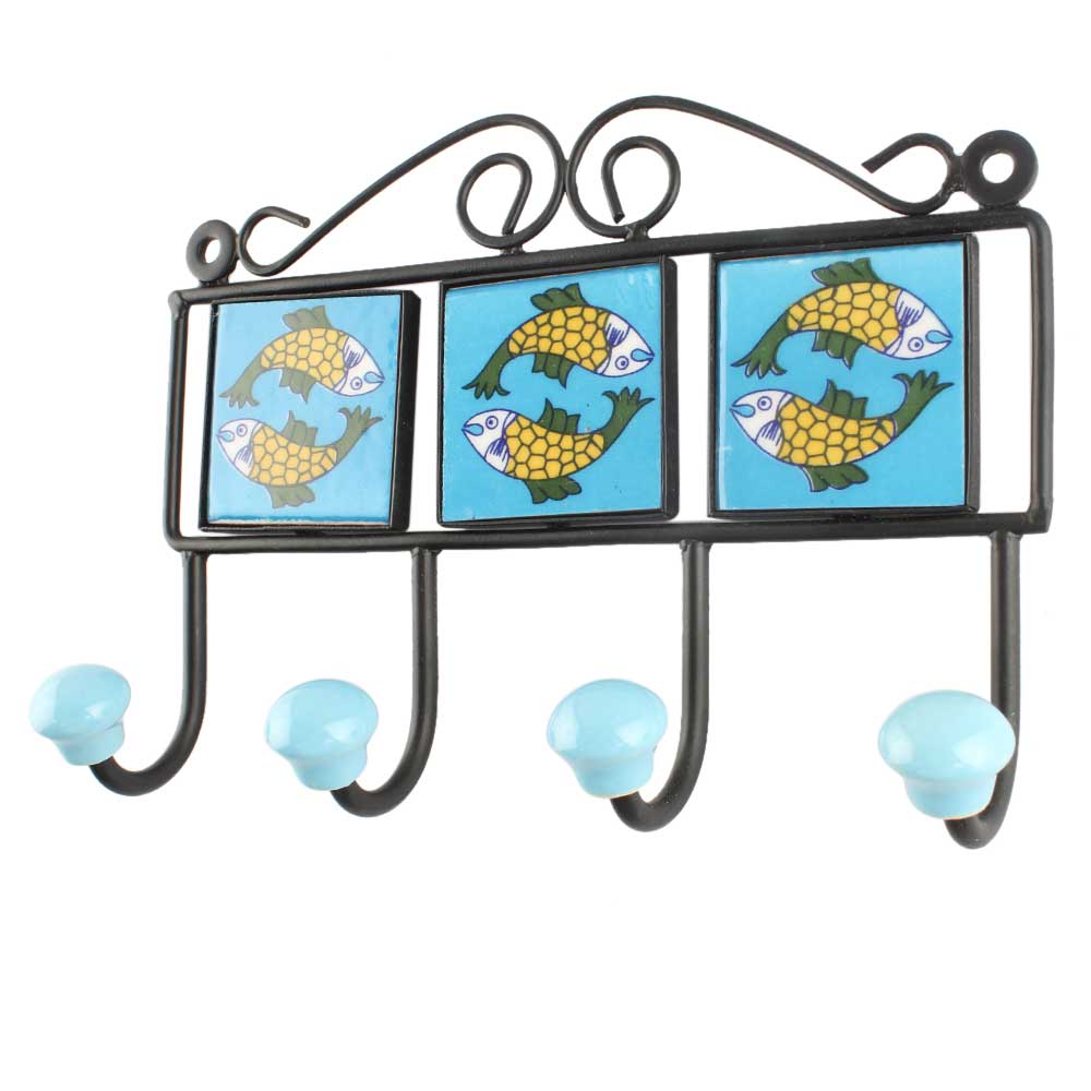 Yellow Fish Ceramic Tile Hook Online. When Put on Wall or Cabinet It is An Art in Itself. The Metal Part of this Hook is Black Powder Coated.