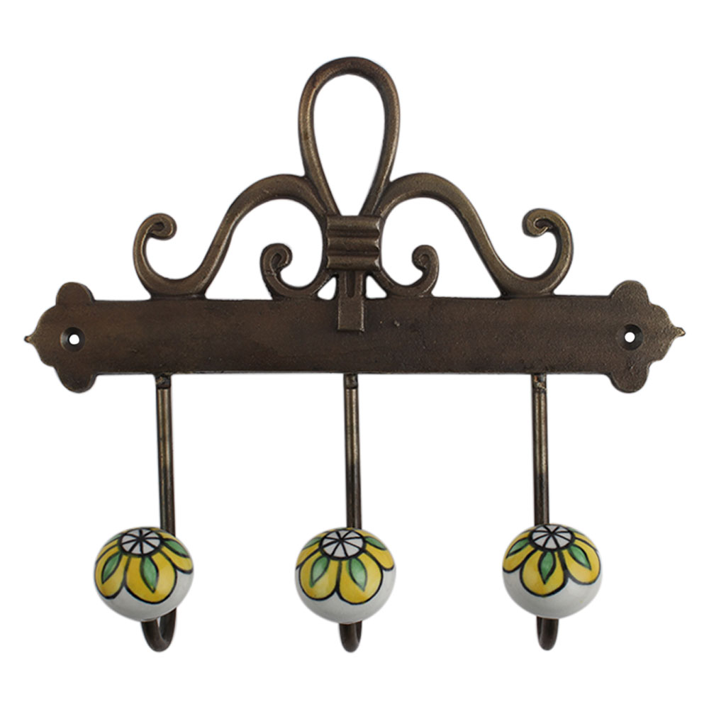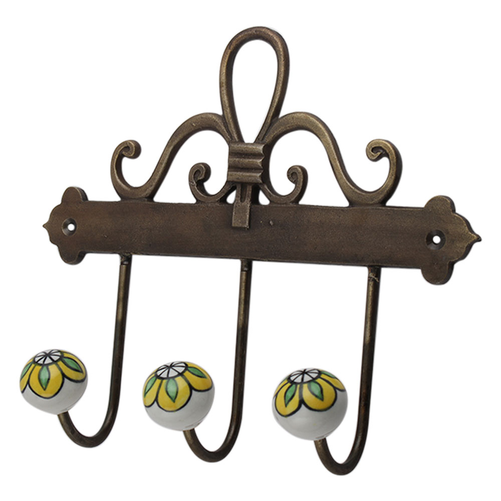 Yellow Floral Ceramic Iron Hook. A Perfect Complement to the Soft Tone of the Wood are these White Traditional Hat & Coat Hook Made of Genuine Porcelain and Brass. It can be use to Hang Jewellery, Leashes, Towels, Scarves, Light Weight Sweaters, Caps Etc.