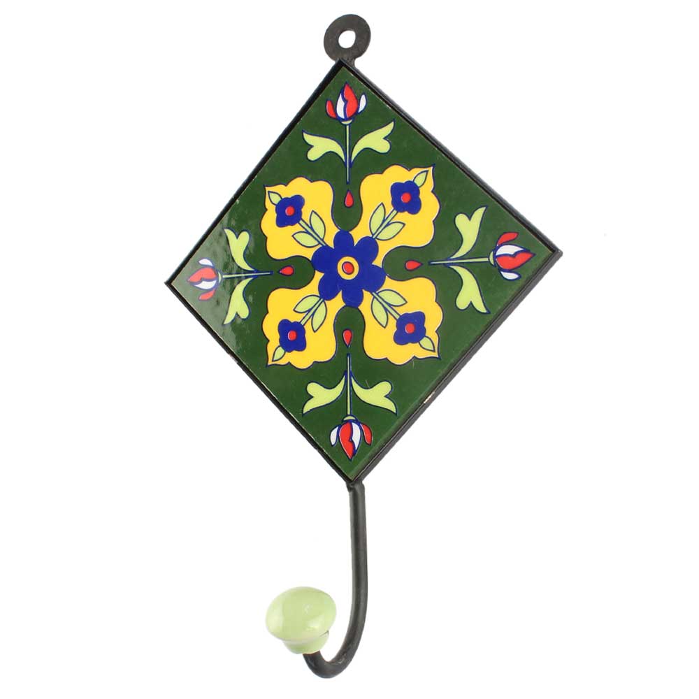 Yellow Floral Ceramic Tile Hook Online. When Put on Wall or Cabinet It is An Art in Itself. The Metal Part of this Hook is Black Powder Coated.