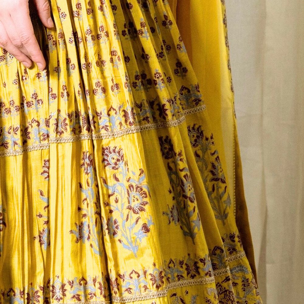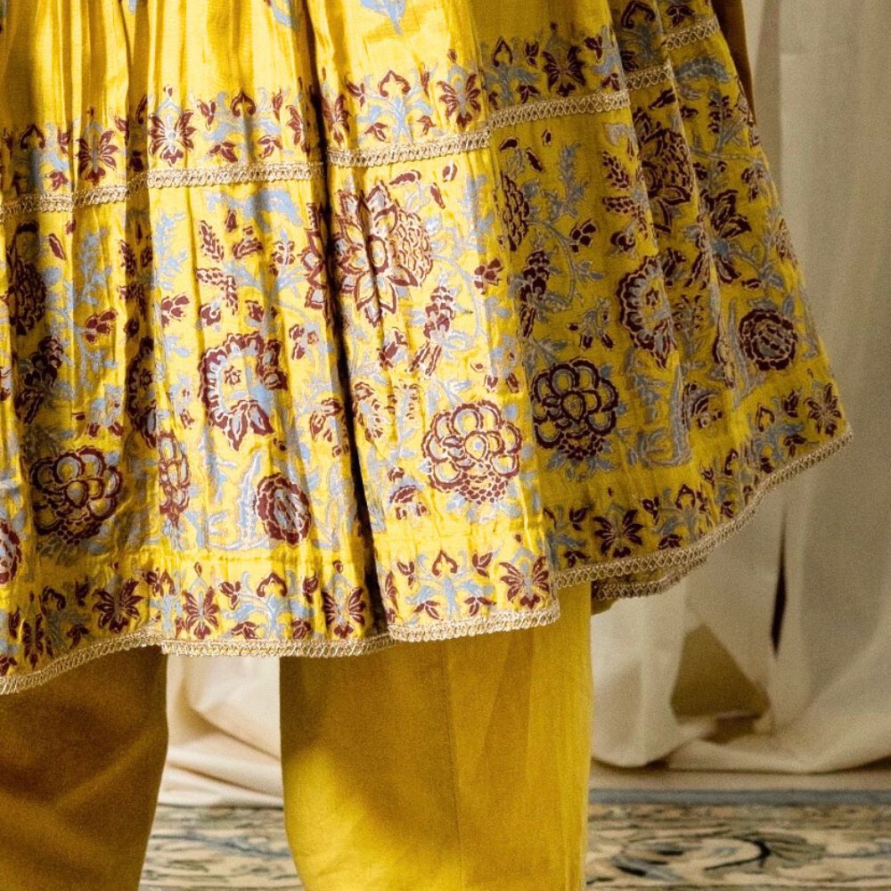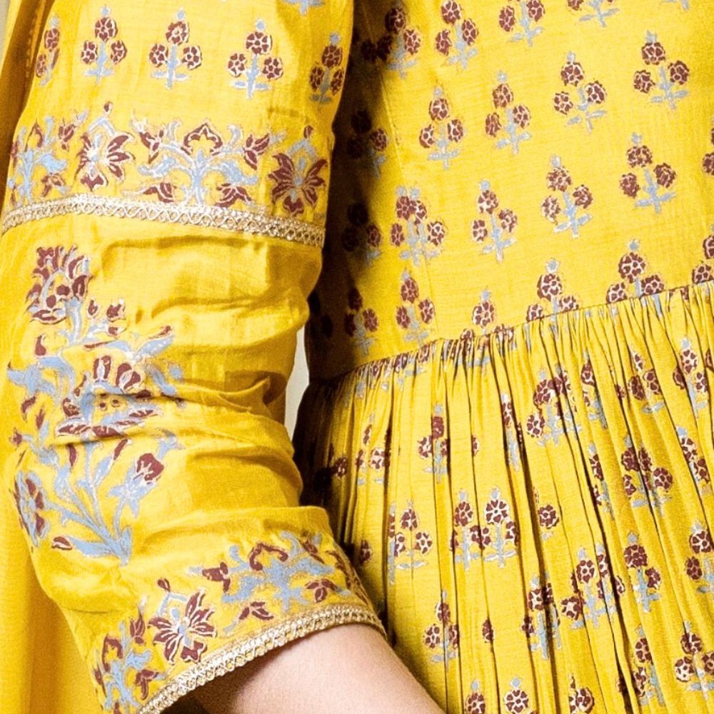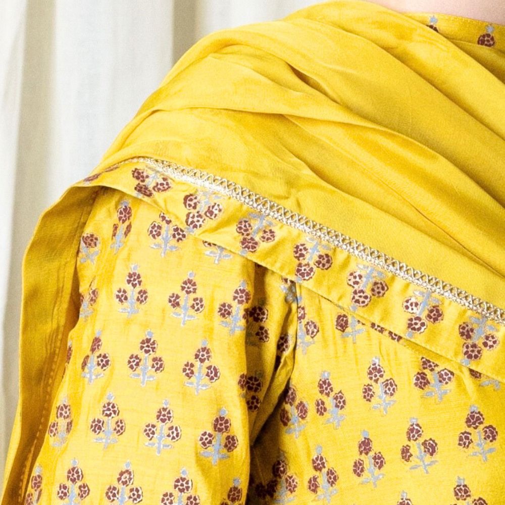 Step into timeless elegance with our Yellow Gathered Anarkali Set, a radiant blend of tradition and comfort. Crafted in soft muslin fabric, the Anarkali kurta features intricate hand block prints that celebrate Indian artistry with floral and paisley motifs. The rich mustard-yellow hue is perfect for festive occasions, day functions, or intimate gatherings. The set includes a cotton bottom that offers breathability and structure, while the flowing silhouette of the Anarkali adds grace to every movement. A luxurious viscose organza dupatta, subtly sheer and featherlight, completes the ensemble with a touch of sophistication. The gathered flare creates a flattering shape, ensuring both comfort and style for all body types. Whether you’re attending a wedding or a celebratory puja, this hand block printed suit set will make you stand out with its vibrant color, handcrafted detailing, and regal charm. Elevate your ethnic wardrobe with this versatile and festive yellow Anarkali set.