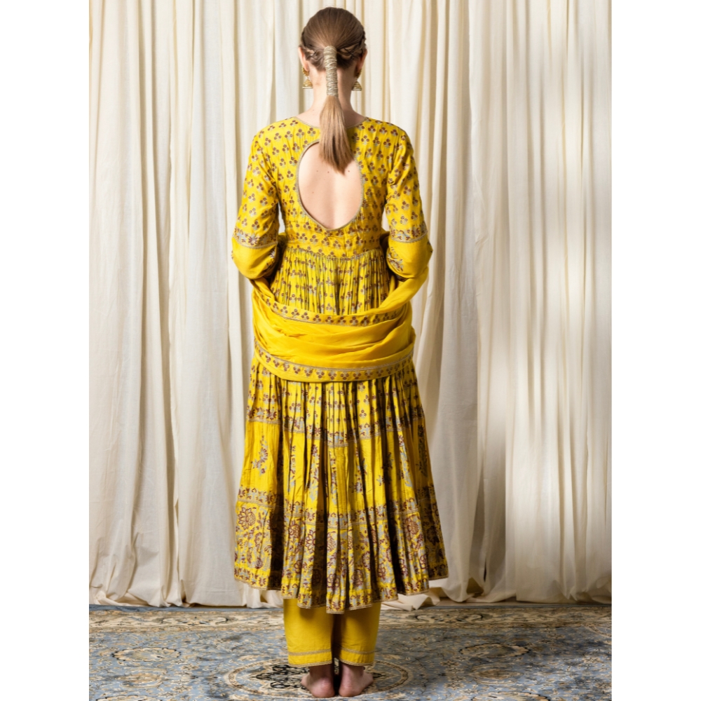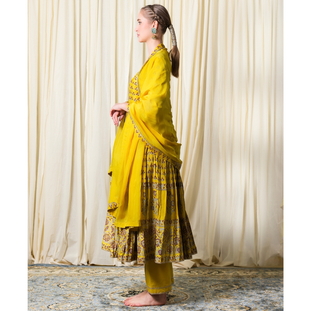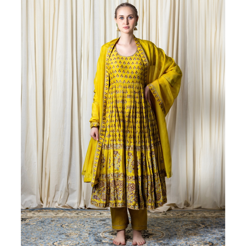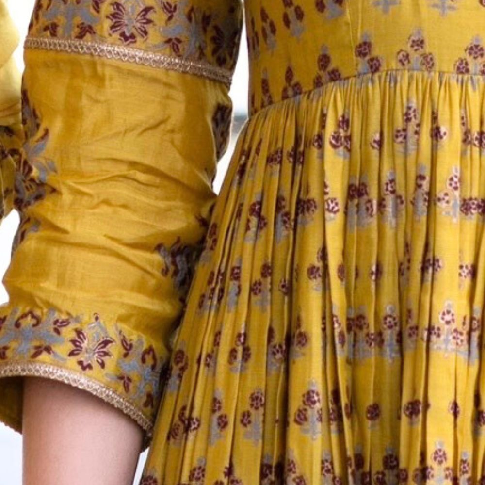 Step into timeless elegance with our Yellow Gathered Anarkali Set, a radiant blend of tradition and comfort. Crafted in soft muslin fabric, the Anarkali kurta features intricate hand block prints that celebrate Indian artistry with floral and paisley motifs. The rich mustard-yellow hue is perfect for festive occasions, day functions, or intimate gatherings. The set includes a cotton bottom that offers breathability and structure, while the flowing silhouette of the Anarkali adds grace to every movement. A luxurious viscose organza dupatta, subtly sheer and featherlight, completes the ensemble with a touch of sophistication. The gathered flare creates a flattering shape, ensuring both comfort and style for all body types. Whether you’re attending a wedding or a celebratory puja, this hand block printed suit set will make you stand out with its vibrant color, handcrafted detailing, and regal charm. Elevate your ethnic wardrobe with this versatile and festive yellow Anarkali set.