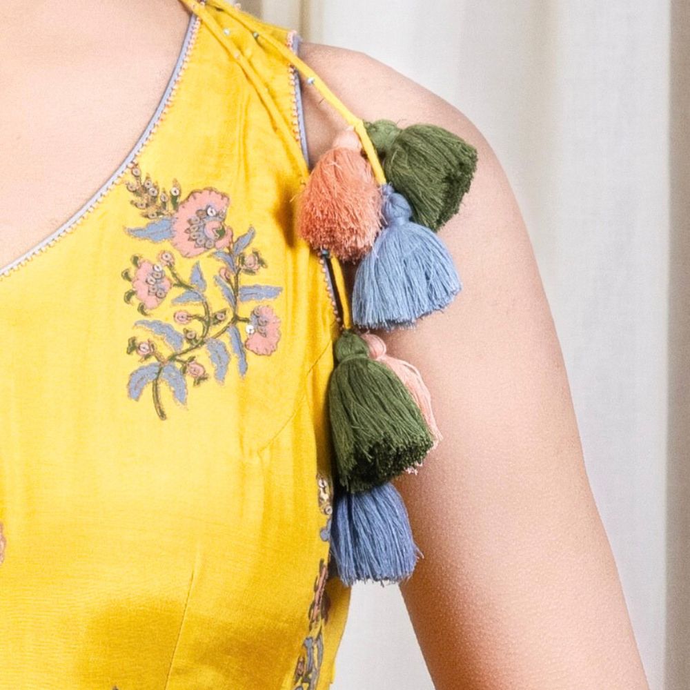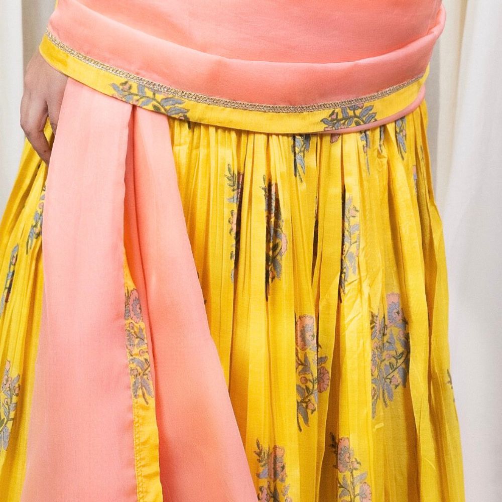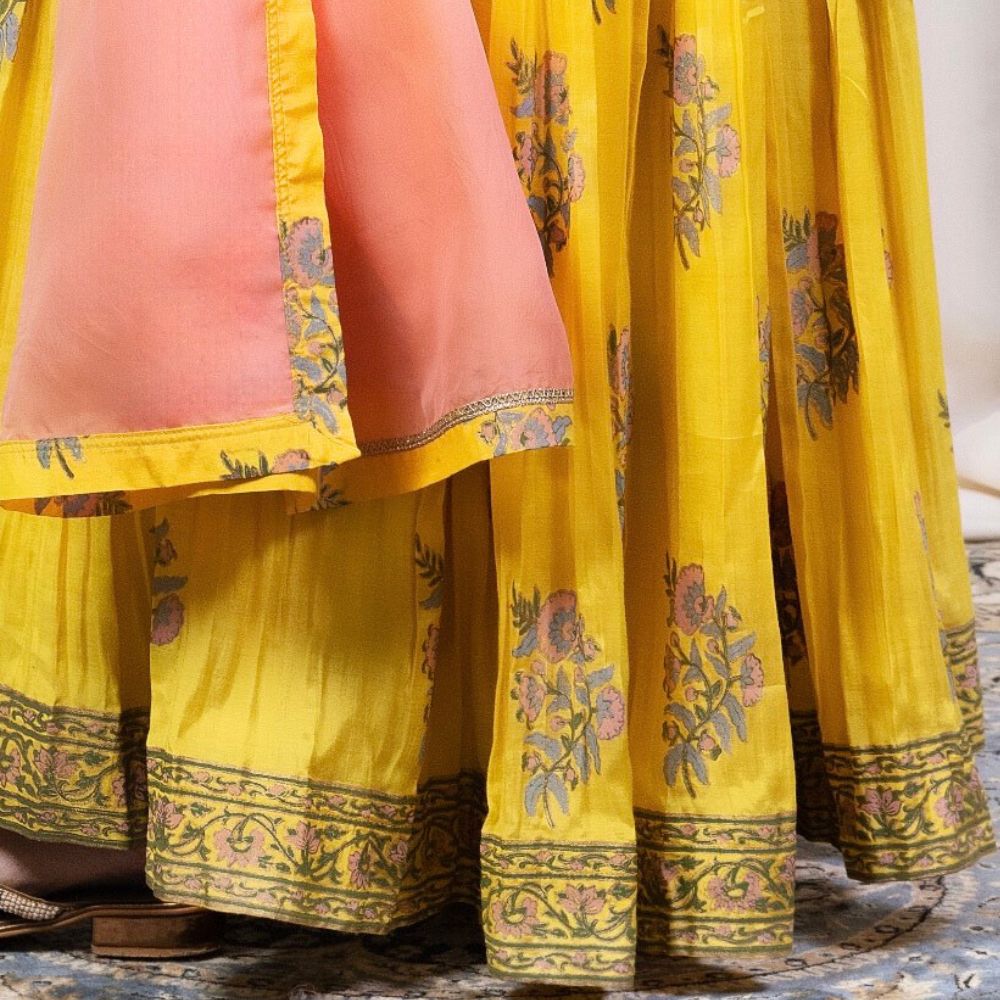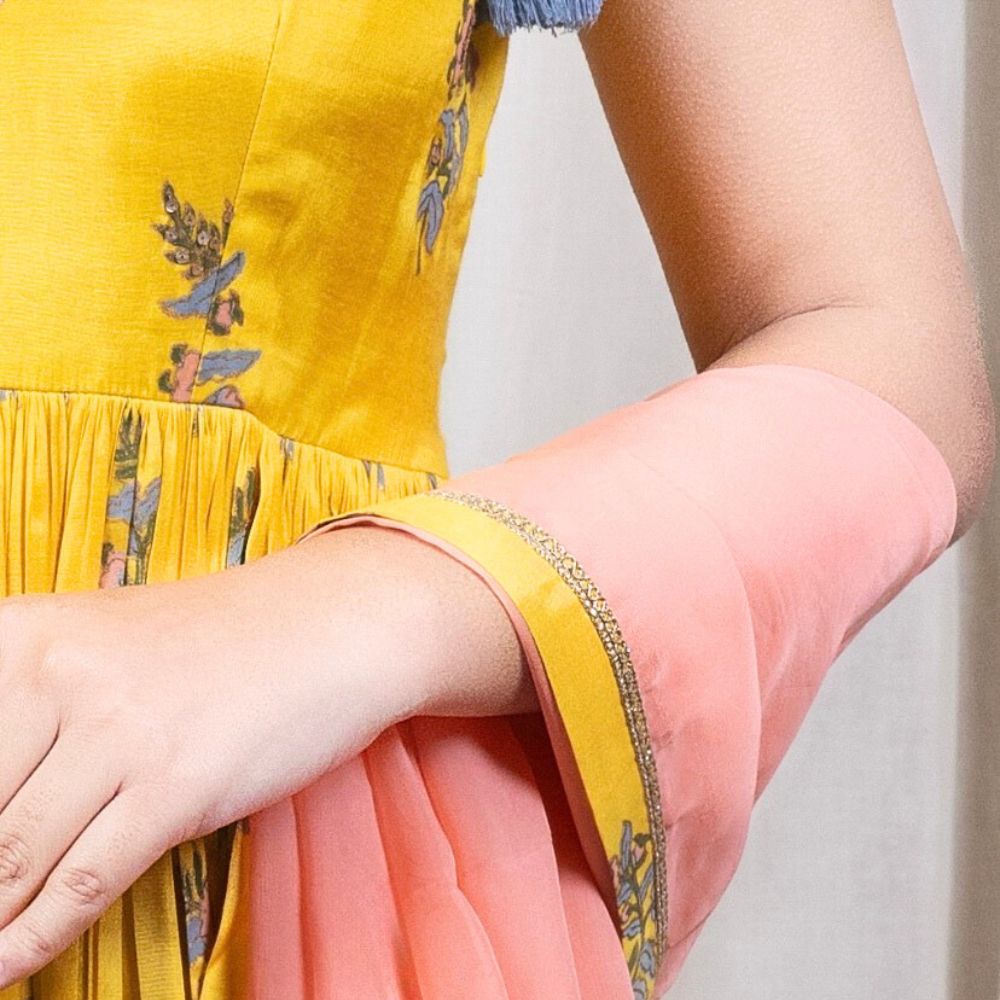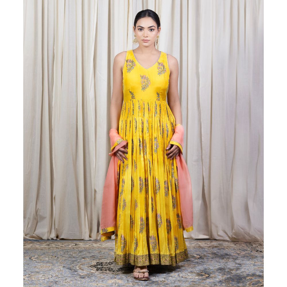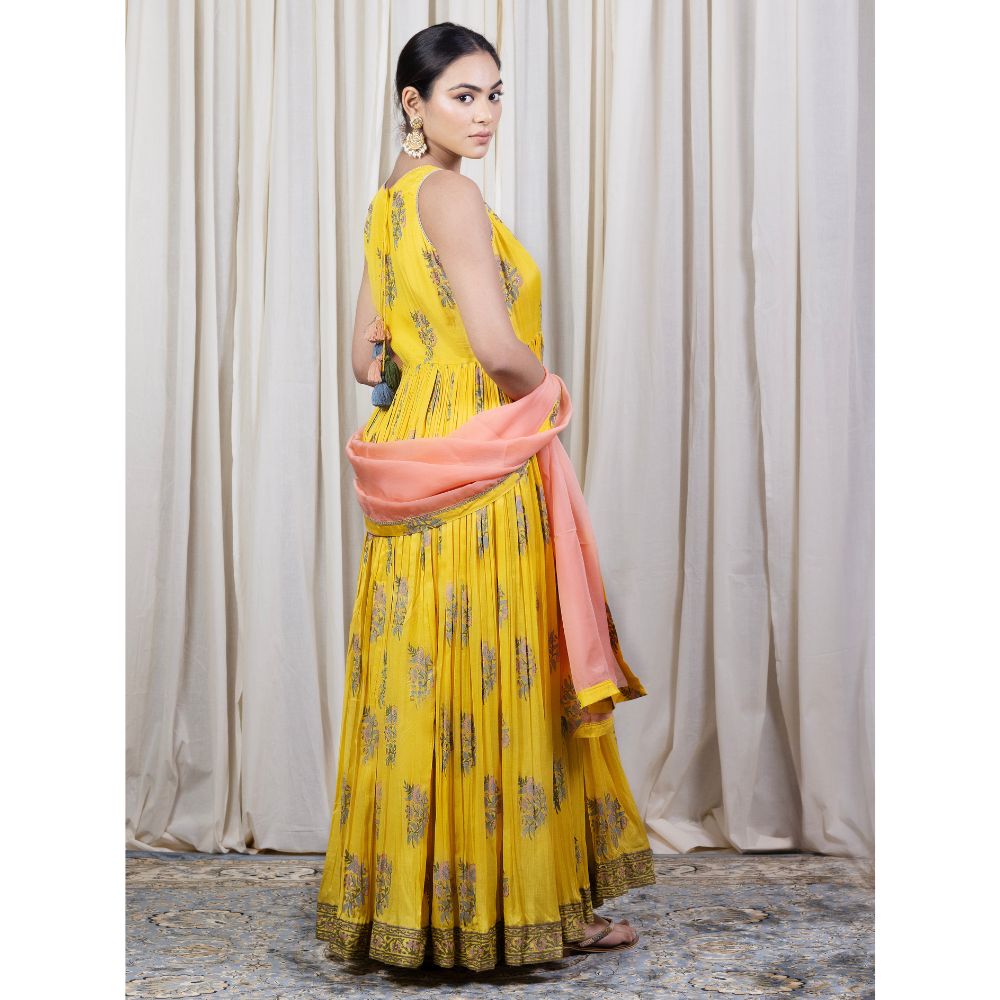 Step into sunshine elegance with this Yellow Gathered Anarkali Set, a radiant blend of tradition and contemporary grace. Crafted in breathable muslin fabric, the sleeveless Anarkali features delicate hand block prints and fine hand embroidery that bring floral motifs to life. The gathered flare creates a voluminous yet flattering silhouette, making it ideal for festive celebrations, daytime weddings, or haldi ceremonies. Paired with a soft cotton bottom for added comfort, the set ensures ease of movement and lasting wear. A lightweight viscose organza dupatta in a soft peach-pink hue with printed edging beautifully complements the vibrant yellow kurta, adding a graceful contrast. The deep neckline and sleeveless cut offer a modern twist to the traditional silhouette, ideal for the contemporary Indian woman. This handcrafted ensemble celebrates Indian craftsmanship while delivering effortless elegance — a must-have addition to your festive wardrobe. Pair with statement earrings and sandals for a complete look.