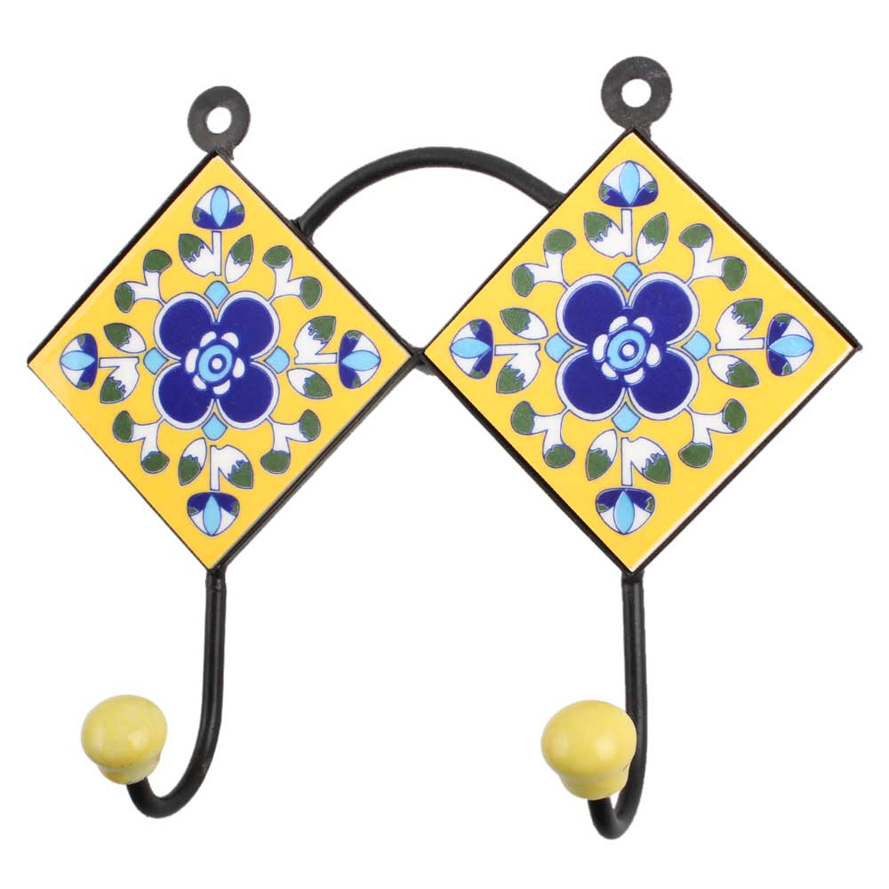 Yellow Navy Blue Floral Tiles Hook. When Put on Wall or Cabinet It is An Art in Itself. the Metal Part of This Hook is Black Powder Coated.