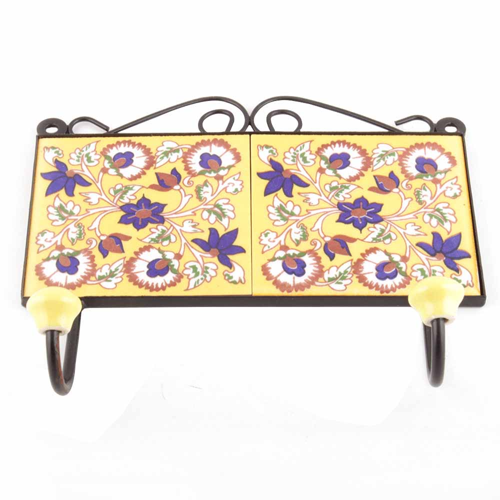 Yellow Navy Blue Floral Tiles Hooks. When Put on Wall or Cabinet it is an Art in itself. The Metal Part of this Hook is Black Powder Coated.