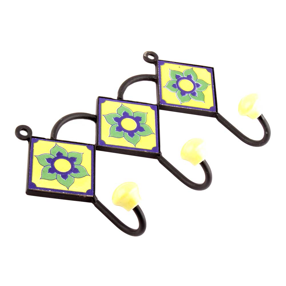 Yellow Navy Blue Floral Tiles Hooks. When Put on Wall or Cabinet it is an Art in itself. The Metal Part of this Hook is Black Powder Coated.