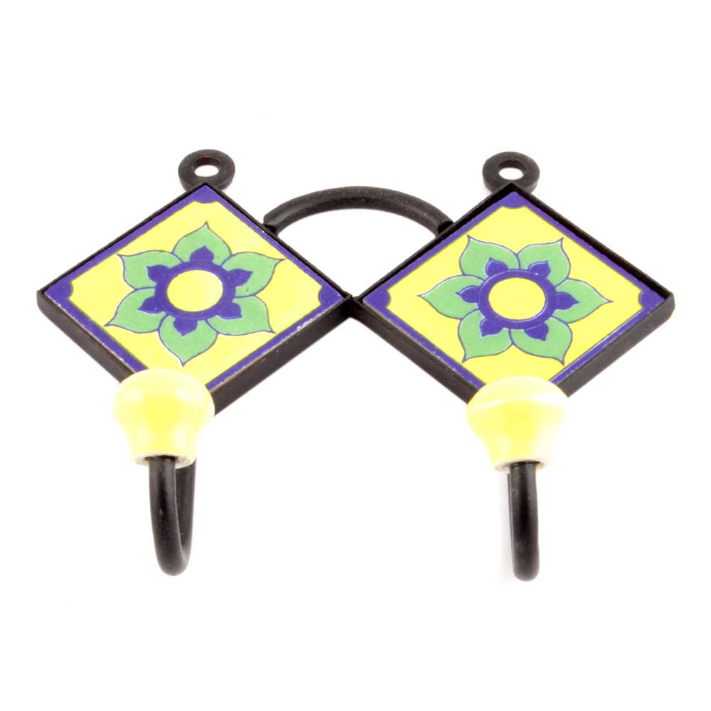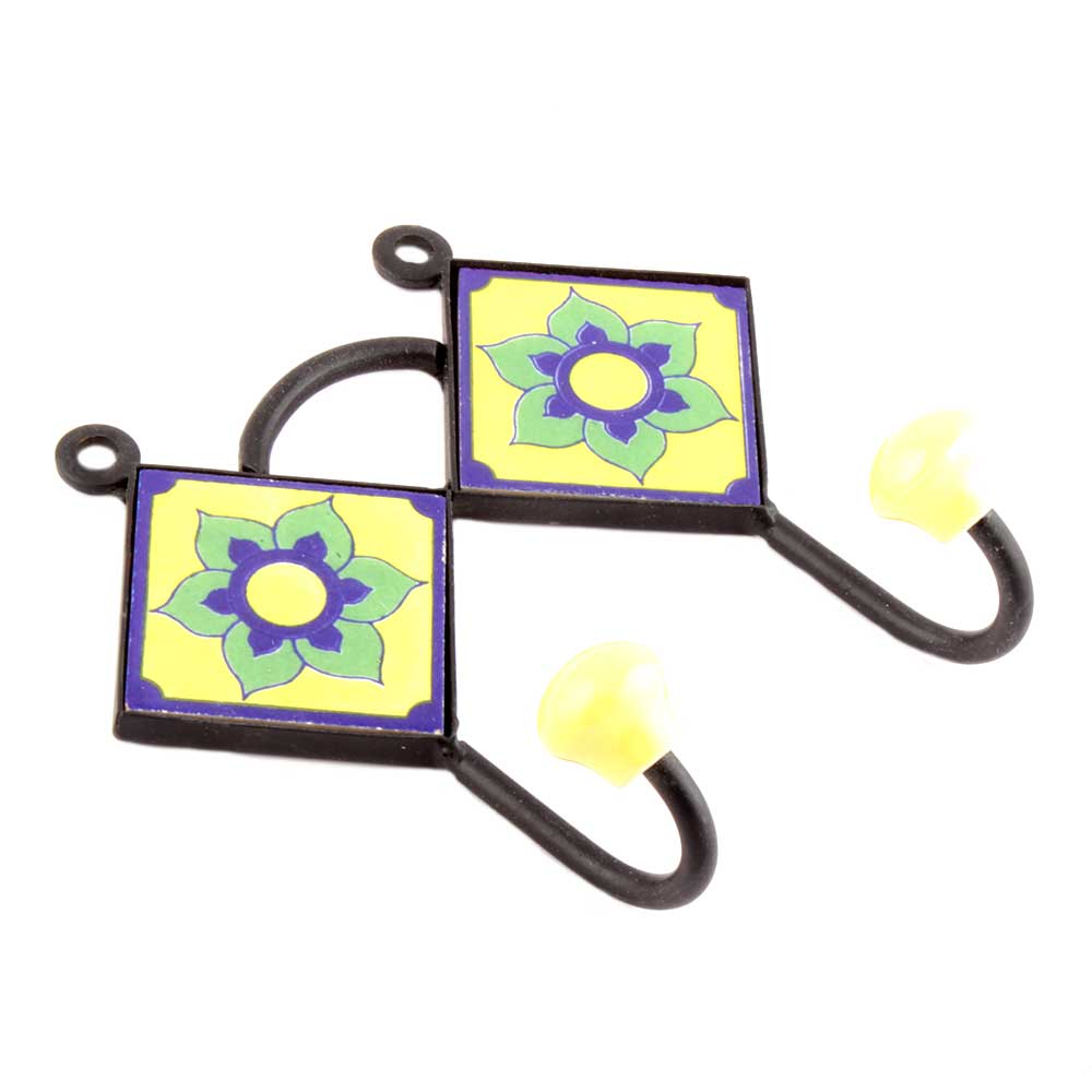 Yellow Navy Blue Flower Tiles Hooks. When Put on Wall or Cabinet it is an Art in itself. The Metal Part of this Hook is Black Powder Coated.