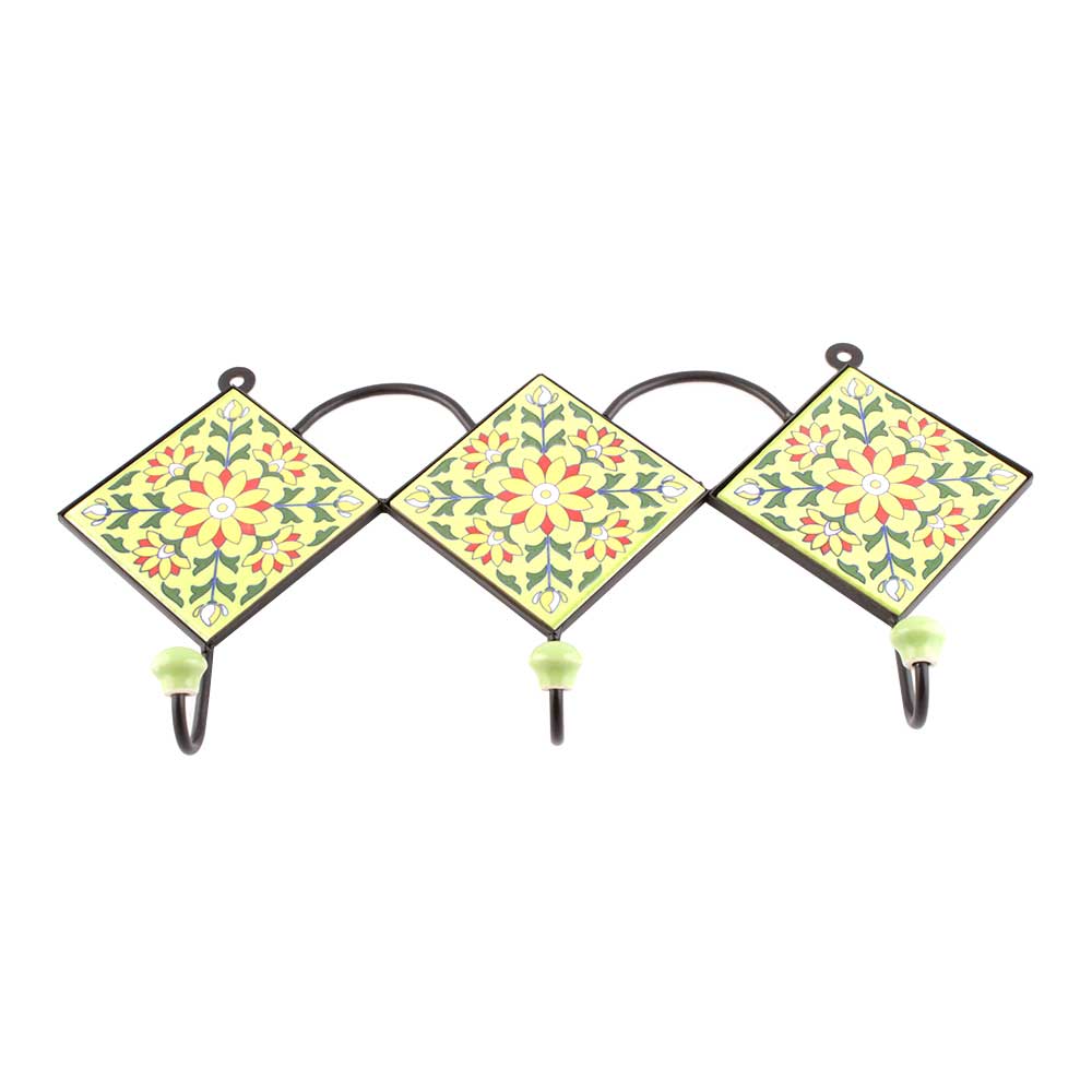 Yellow Red Ceramic Floral Tiles Hooks Online. When Put on Wall or Cabinet it is an Art in itself. The Metal Part of this Hook is Black Powder Coated.
