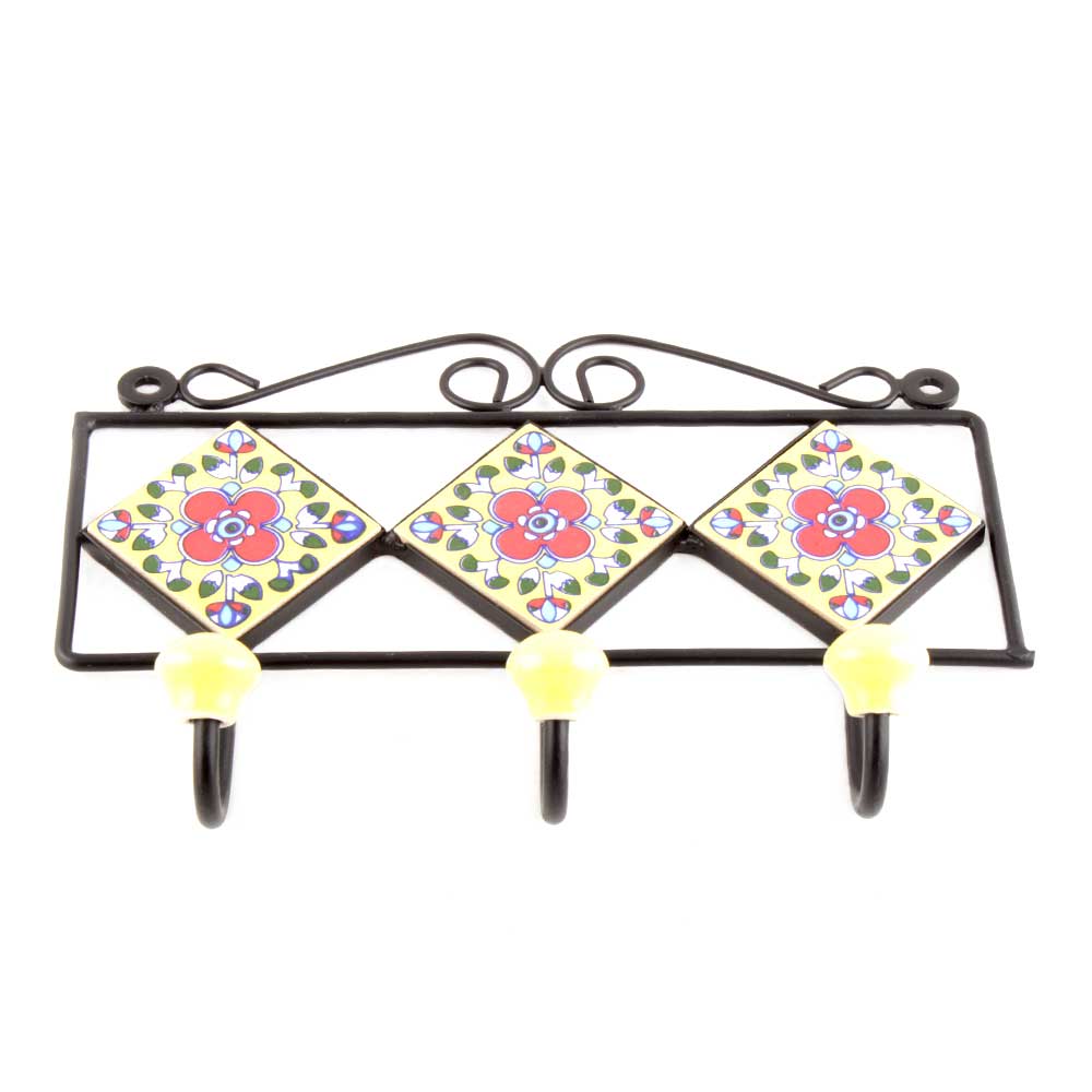 Yellow Red Floral Tiles Hooks. When Put on Wall or Cabinet it is an Art in itself. The Metal Part of this Hook is Black Powder Coated.
