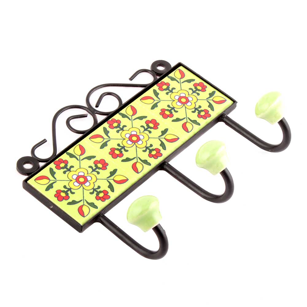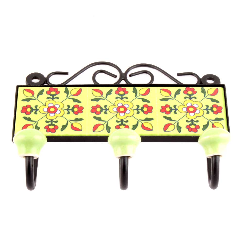 Yellow Red Floral Tiles Hooks. When Put on Wall or Cabinet it is an Art in itself. The Metal Part of this Hook is Black Powder Coated.