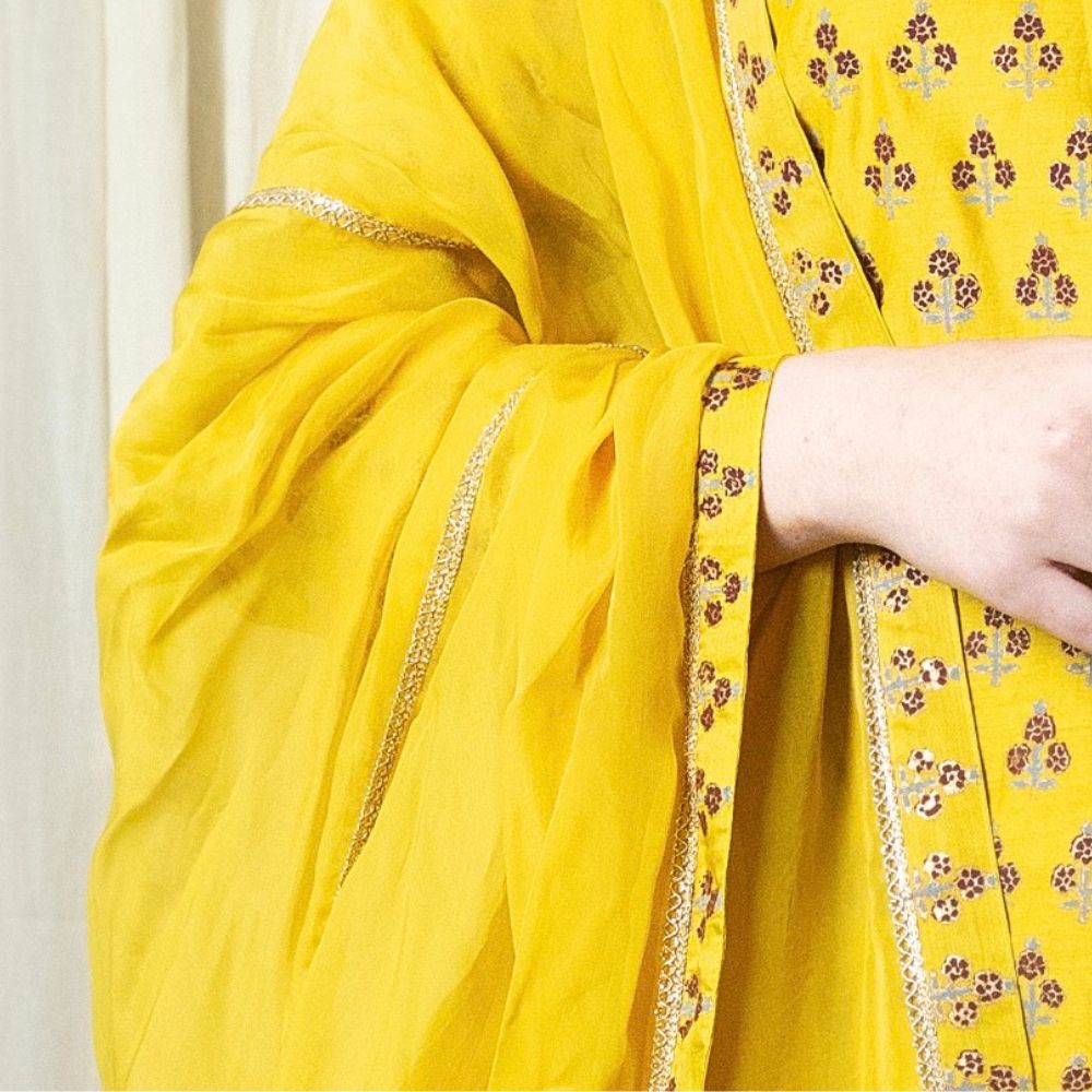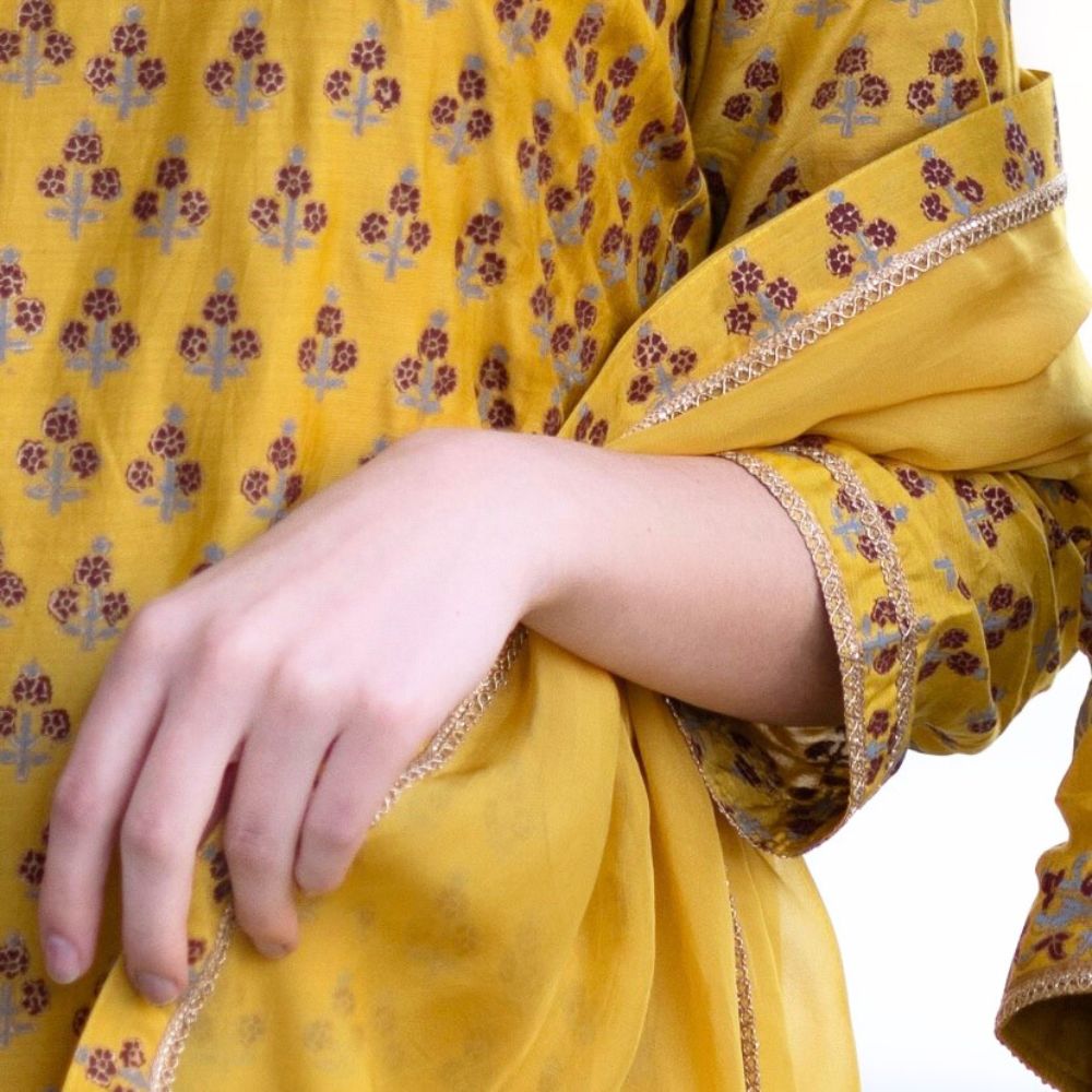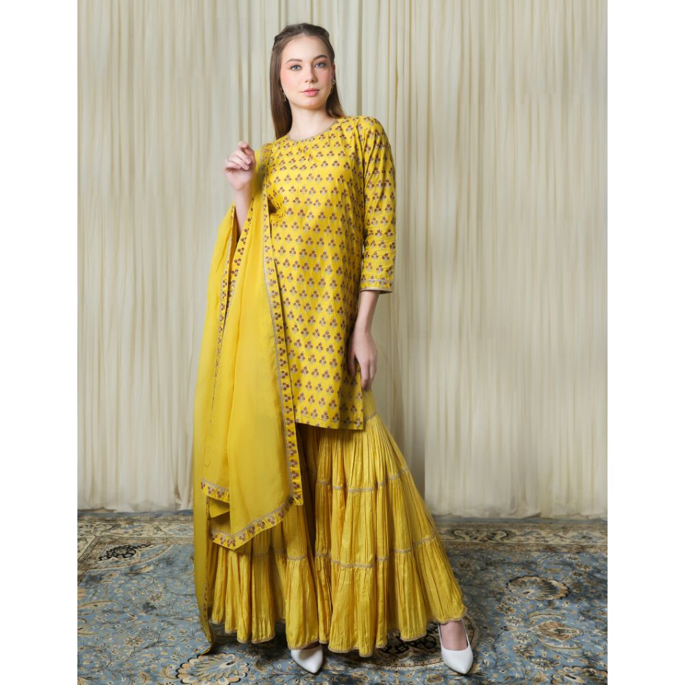 Brighten your festive wardrobe with this vibrant Yellow Short Kurta with Tiered Sharara Set, crafted in lightweight muslin fabric and adorned with exquisite hand block printing. The short kurta features a straight silhouette with three-quarter sleeves and delicate floral motifs that highlight the artistry of Indian block printing. Paired with a dramatic tiered sharara in the same muslin fabric, the set brings playful volume and effortless elegance to any celebration. The rich mustard yellow hue adds a cheerful pop, making it ideal for haldi ceremonies, festive events, or day weddings. A sheer viscose organza dupatta with printed edging completes the ensemble, adding a graceful drape that balances the structured sharara. Designed for modern women who appreciate traditional aesthetics, this handcrafted outfit blends comfort with regal charm. Whether styled with jhumkas or mojaris, this yellow kurta-sharara set ensures you stand out with handcrafted finesse and joyful flair.