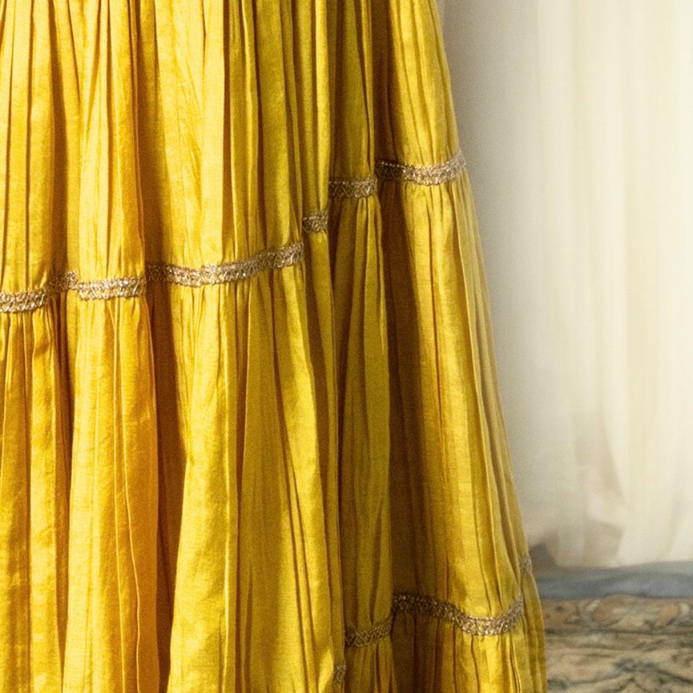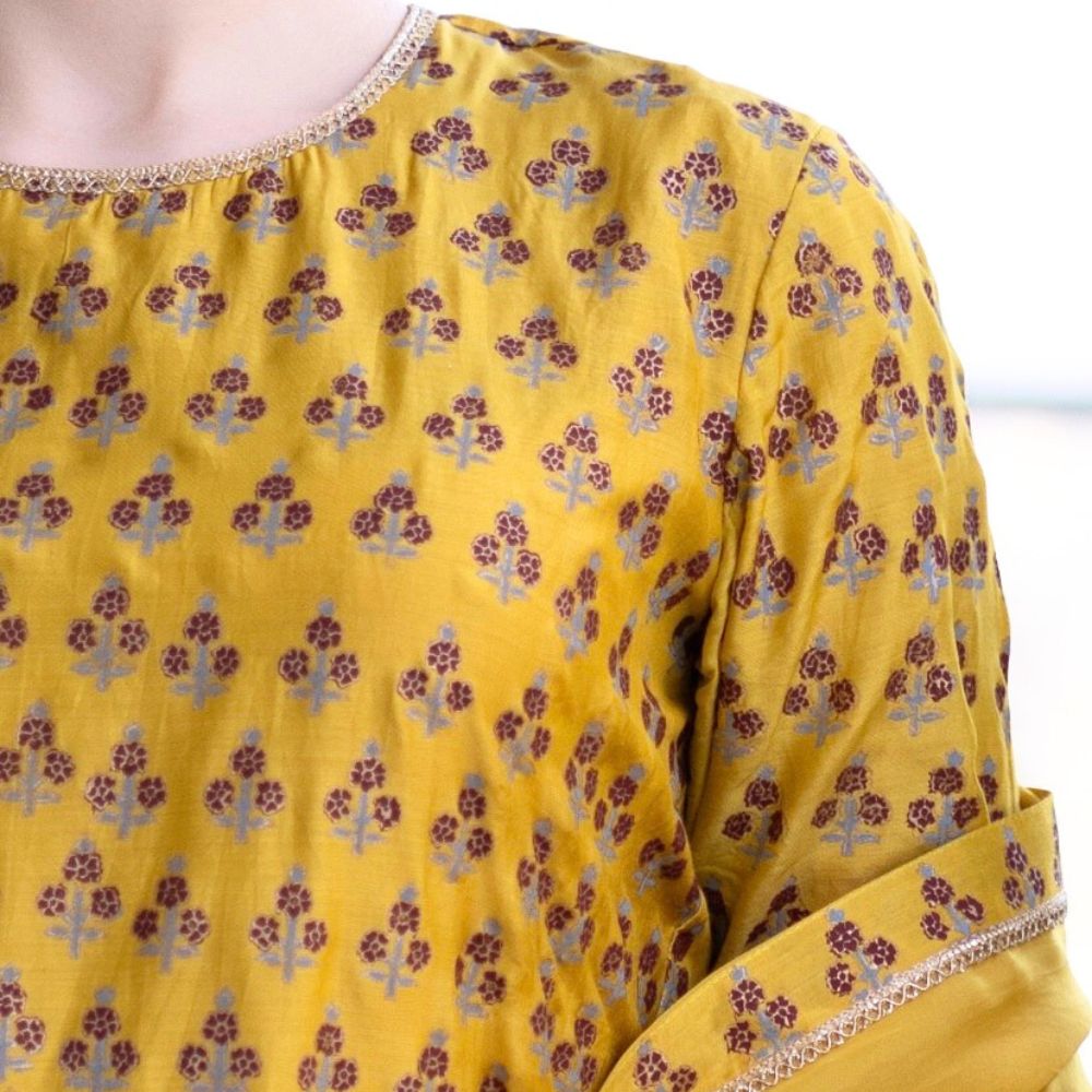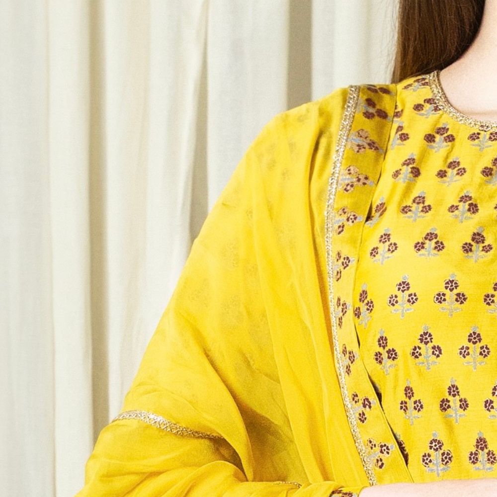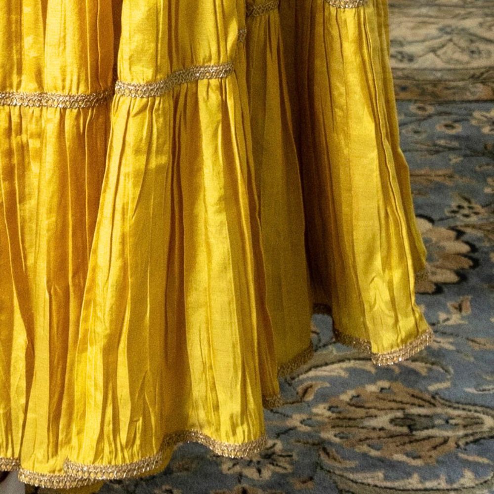 Brighten your festive wardrobe with this vibrant Yellow Short Kurta with Tiered Sharara Set, crafted in lightweight muslin fabric and adorned with exquisite hand block printing. The short kurta features a straight silhouette with three-quarter sleeves and delicate floral motifs that highlight the artistry of Indian block printing. Paired with a dramatic tiered sharara in the same muslin fabric, the set brings playful volume and effortless elegance to any celebration. The rich mustard yellow hue adds a cheerful pop, making it ideal for haldi ceremonies, festive events, or day weddings. A sheer viscose organza dupatta with printed edging completes the ensemble, adding a graceful drape that balances the structured sharara. Designed for modern women who appreciate traditional aesthetics, this handcrafted outfit blends comfort with regal charm. Whether styled with jhumkas or mojaris, this yellow kurta-sharara set ensures you stand out with handcrafted finesse and joyful flair.