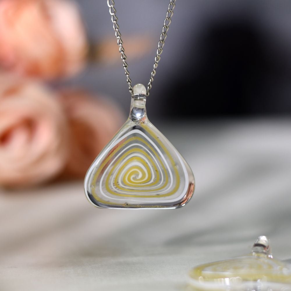 Illuminate your jewelry collection with the vibrant charm of this Yellow Spiral Triangle Lampwork Glass Pendant, a handcrafted masterpiece that radiates warmth and creativity. Expertly shaped through the traditional lampwork technique, molten glass is transformed into a triangular form adorned with swirling yellow spirals. The glowing tones and balanced geometry create a piece that embodies energy, positivity, and artistic sophistication — perfect for handmade necklaces or thoughtful gifting.
