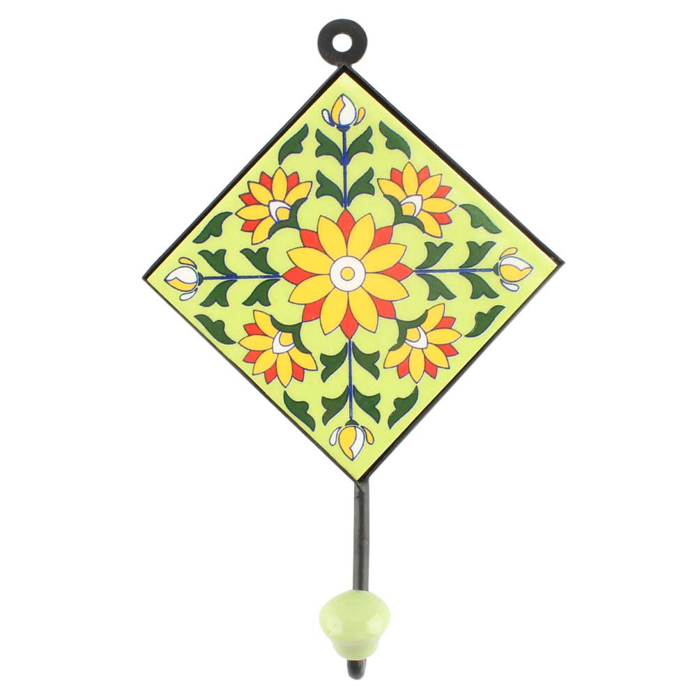 Yellow Sunflower Ceramic Tile Wall Hook in Pea Green Base. When Put on Wall or Cabinet It is An Art in Itself. The Metal Part of this Hook is Black Powder Coated.