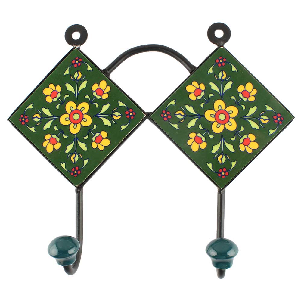 Yellow Tiny Flower Ceramic Tile Hook. When Put on Wall or Cabinet It is An Art in Itself. The Metal Part of this Hook is Black Powder Coated.