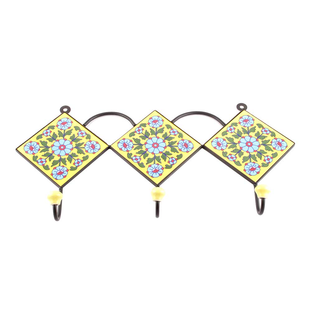 Yellow Turquoise Tiny Flower Ceramic Tiles Hooks. When Put on Wall or Cabinet it is an Art in itself. The Metal Part of this Hook is Black Powder Coated.