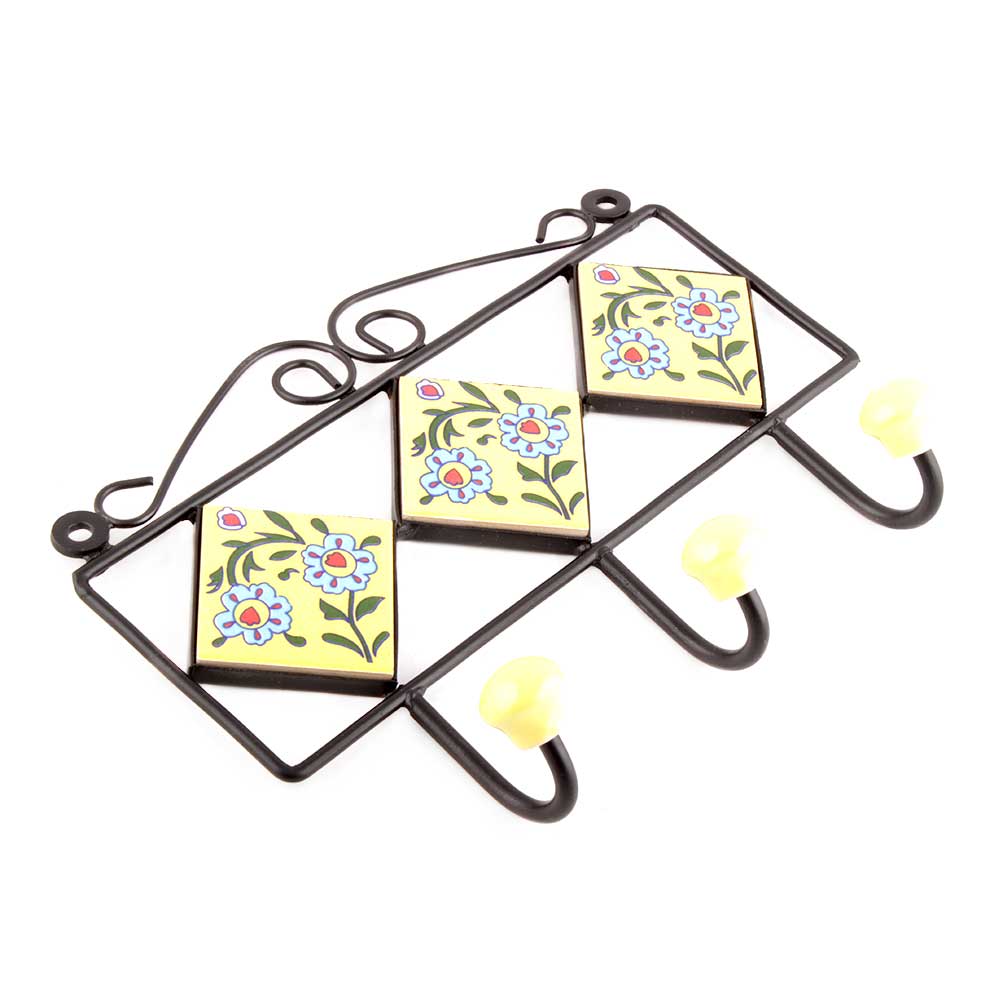 Yellow Turquoise Tiny Flower Tiles Hook. When Put on Wall or Cabinet it is an Art in itself. The Metal Part of this Hook is Black Powder Coated.