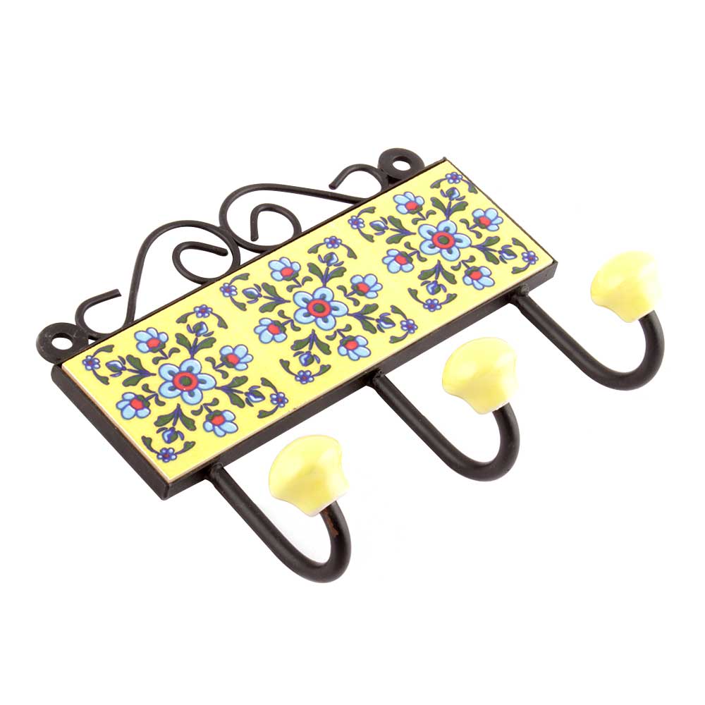 Yellow Turquoise Tiny Flower Tiles Hooks. When Put on Wall or Cabinet it is an Art in itself. The Metal Part of this Hook is Black Powder Coated.