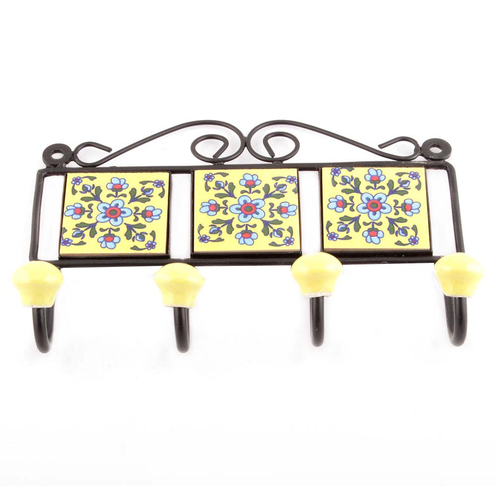 Yellow Turquoise Tiny Flower Tiles Hooks. When Put on Wall or Cabinet it is an Art in itself. The Metal Part of this Hook is Black Powder Coated.