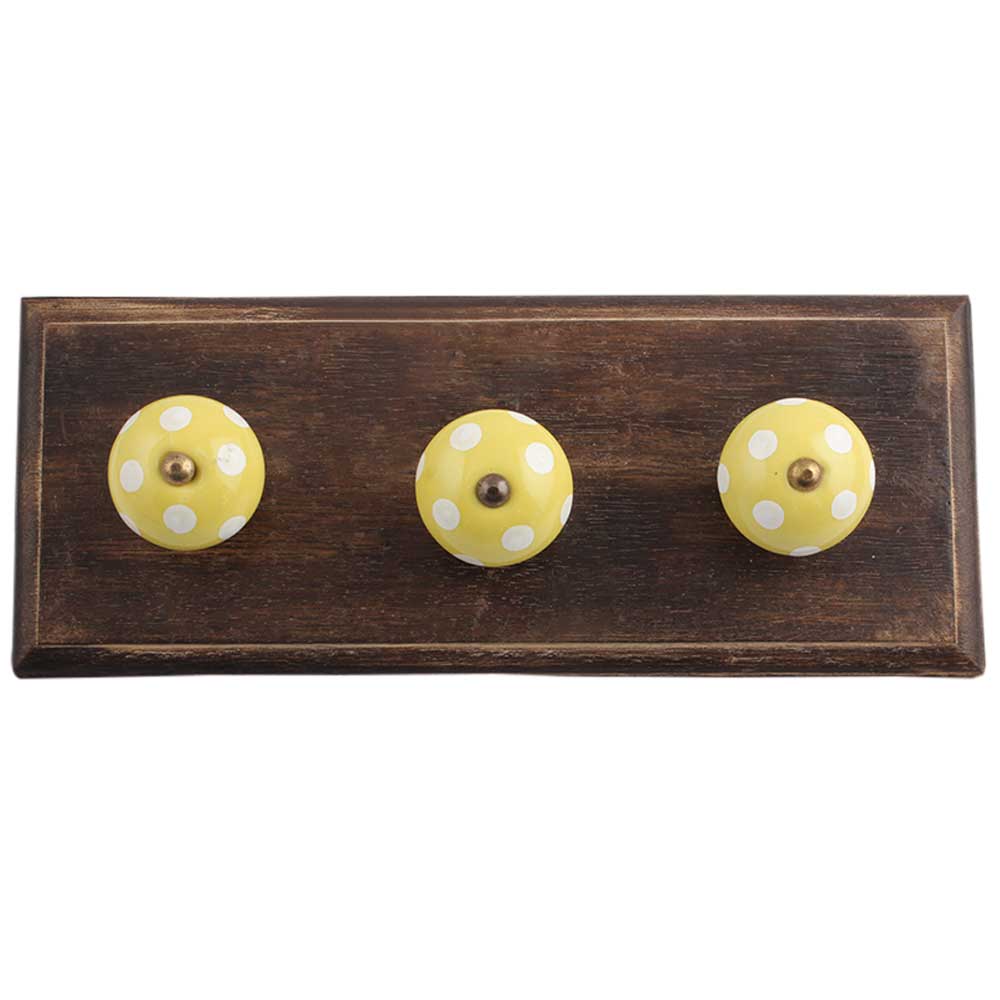 Yellow White Dot Wooden Hooks. A Perfect Complement to the Soft Tone of the Wood are these White Traditional Hat Coat Hook Made of Genuine Porcelain and Brass. It can be use to Hang Jewellery, Leashes, Towels, Scarves, Light Weight Sweaters, Caps Etc.