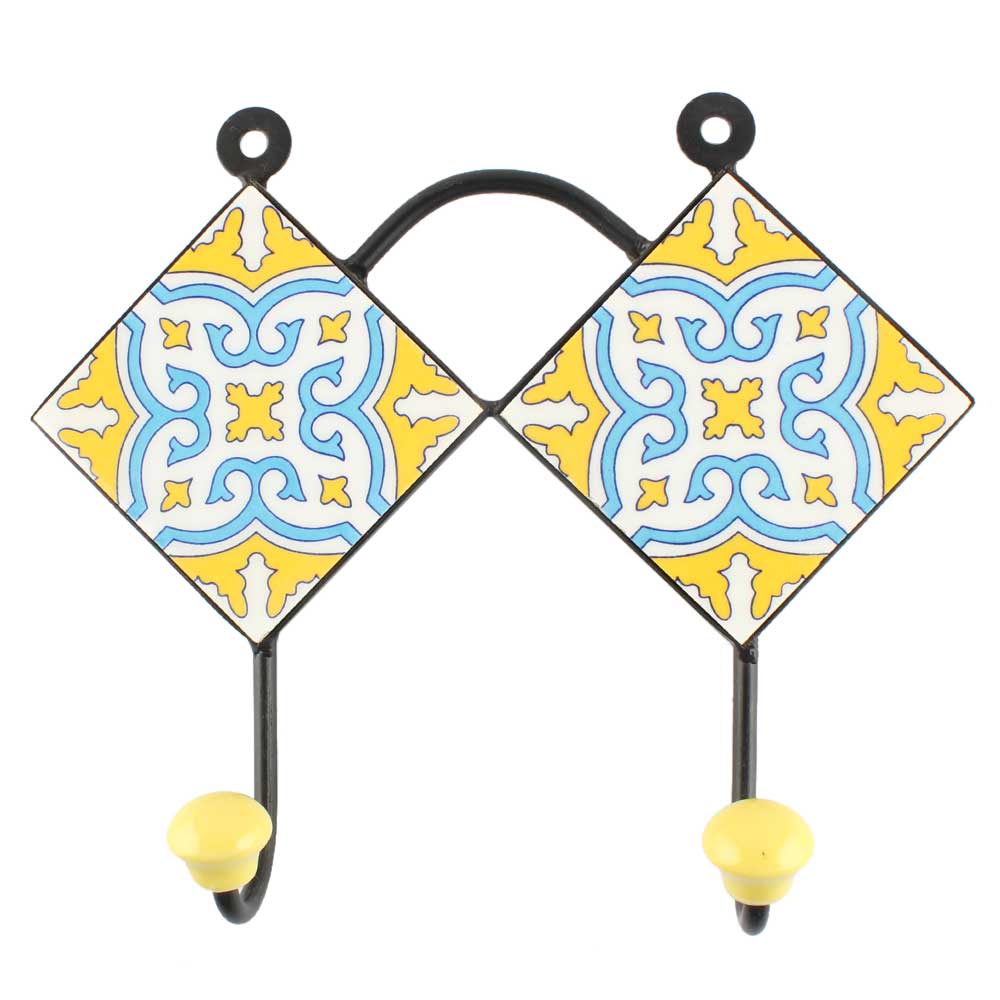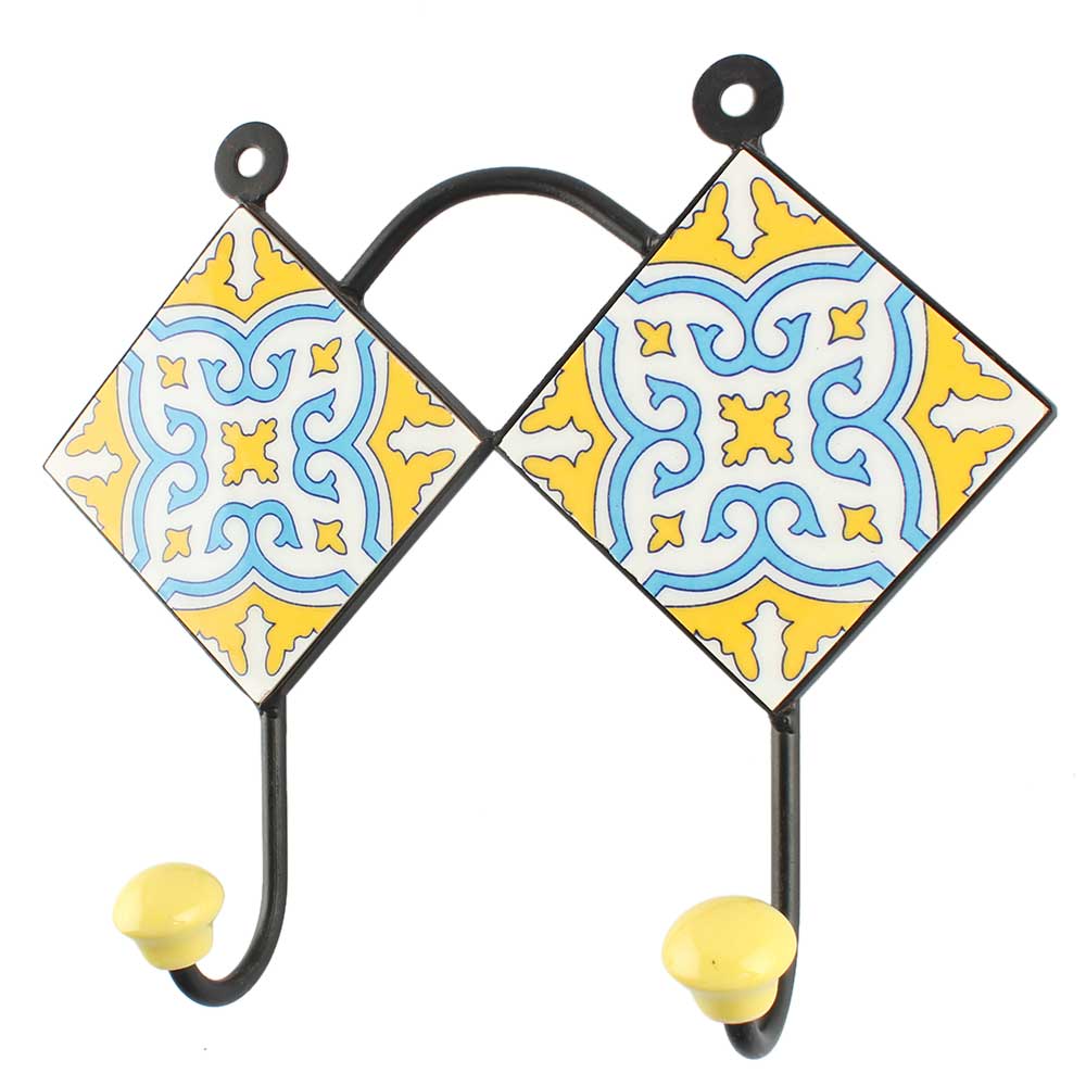 Yellow With Turquoise Floral Ceramic Tile Wall Hook