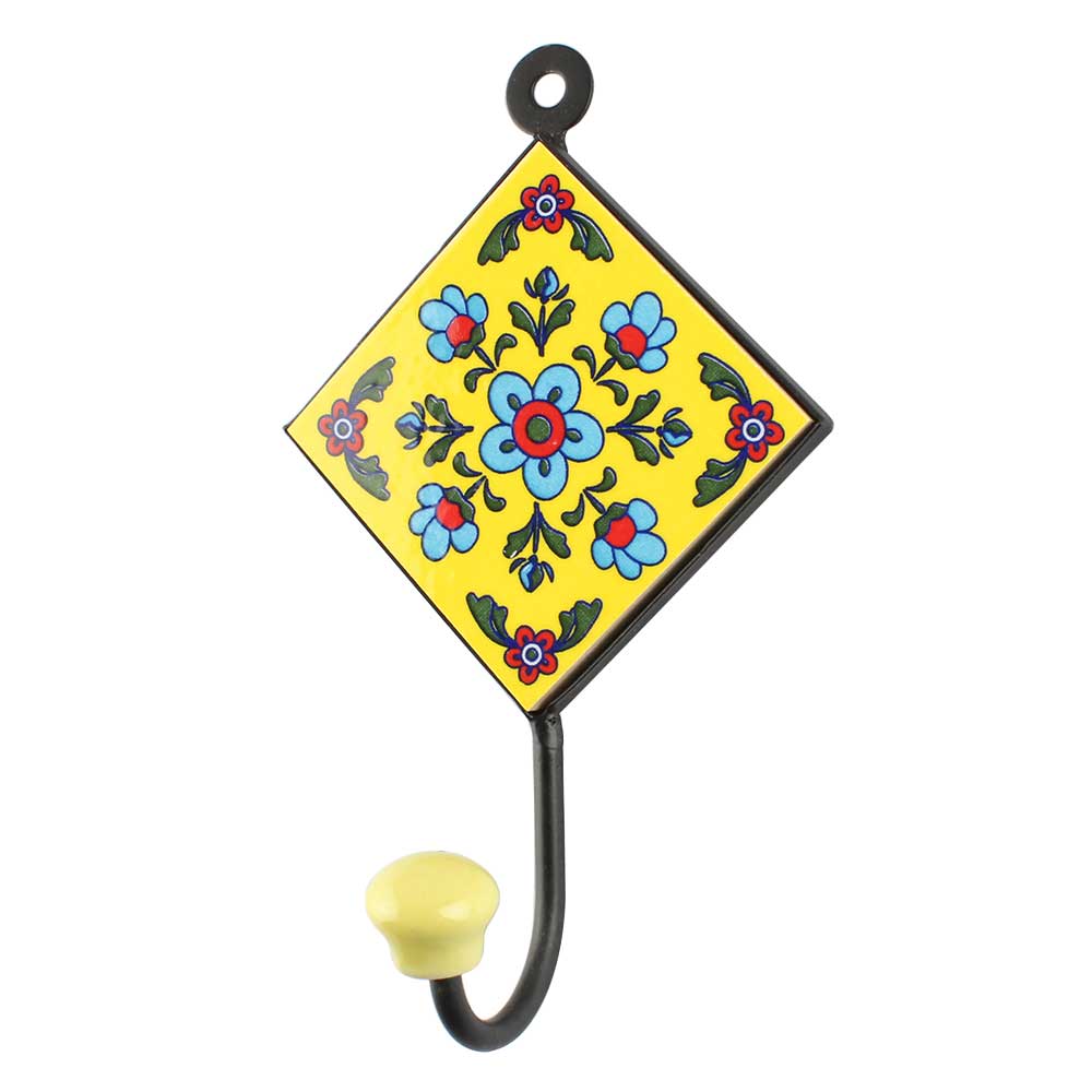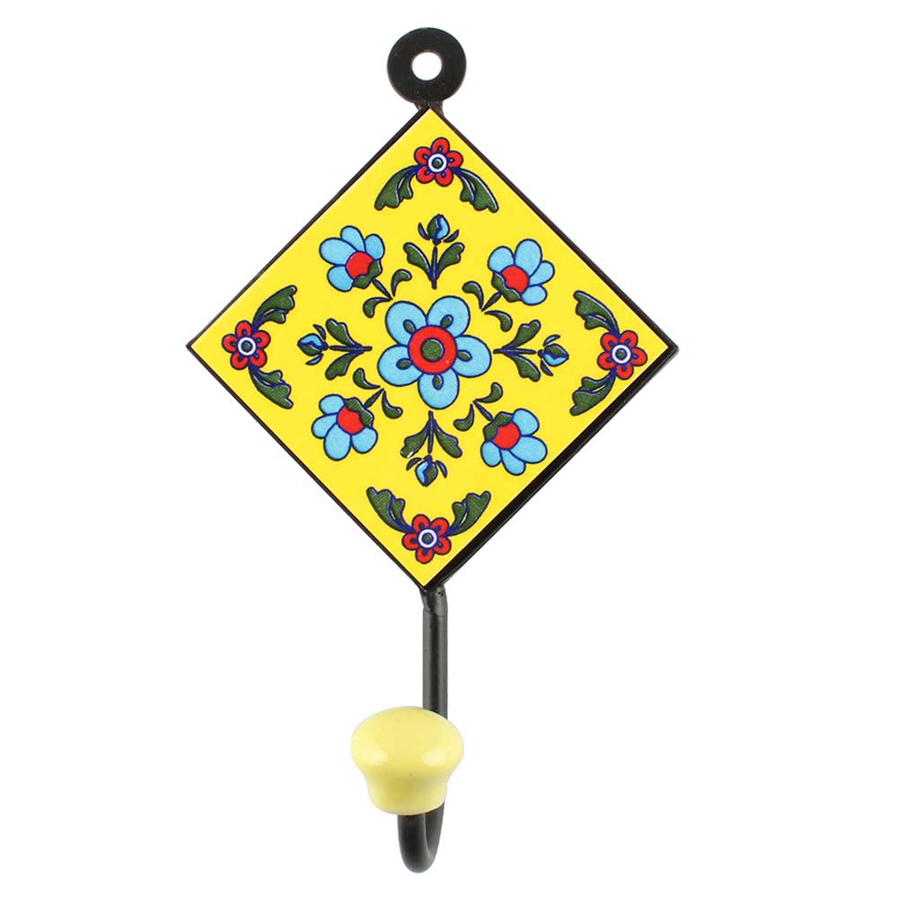 Yellow With Turquoise Tiny Flower Ceramic Tiles Hook. When Put on Wall or Cabinet It is An Art in Itself. The Metal Part of this Hook is Black Powder Coated.